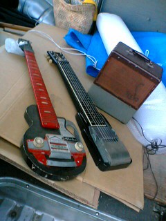 その小さい黒いギターはたぶん(イヤ、絶対)ラップスティールギターですね。ひざの上に寝かせてスライド(ラップスティール用の)させて弾くギターです。エーのはエー音しまっせ。