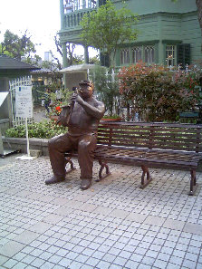 この写真は、異人館のベンチに座ったミュージシャン